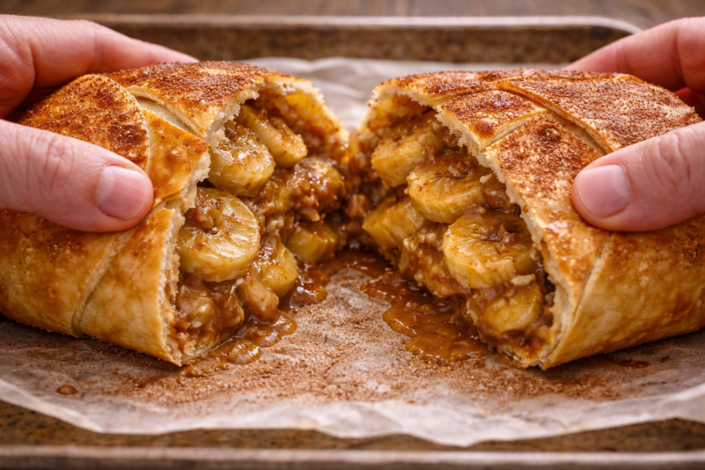 Esse strudel de banana trançado douradinho é amor à primeira mordida – a massa estala, a banana derrete com canela e todo mundo pergunta “quem fez isso?”. Faz pro lanche hoje e me conta nos comentários se sobrou algum pedaço! Salva o post, compartilha no grupo da família e bora espalhar esse trem bão docinho.