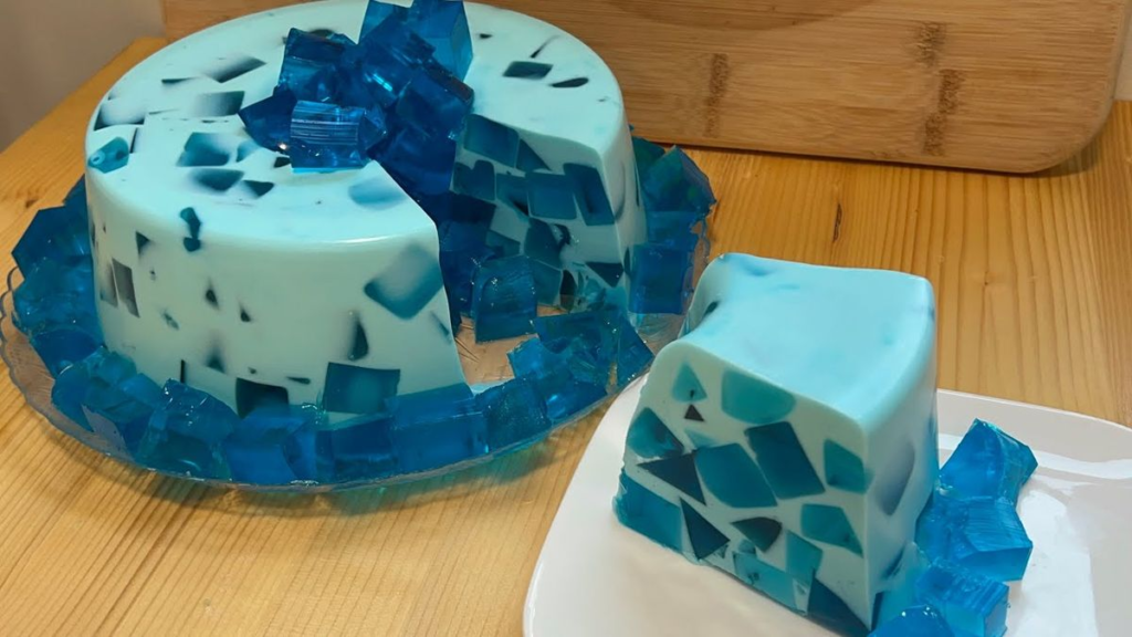 Coloque os cubinhos de gelatina azul em uma forma (preferencialmente de silicone). Despeje o creme branco por cima. Leve à geladeira por pelo menos 4 horas.
