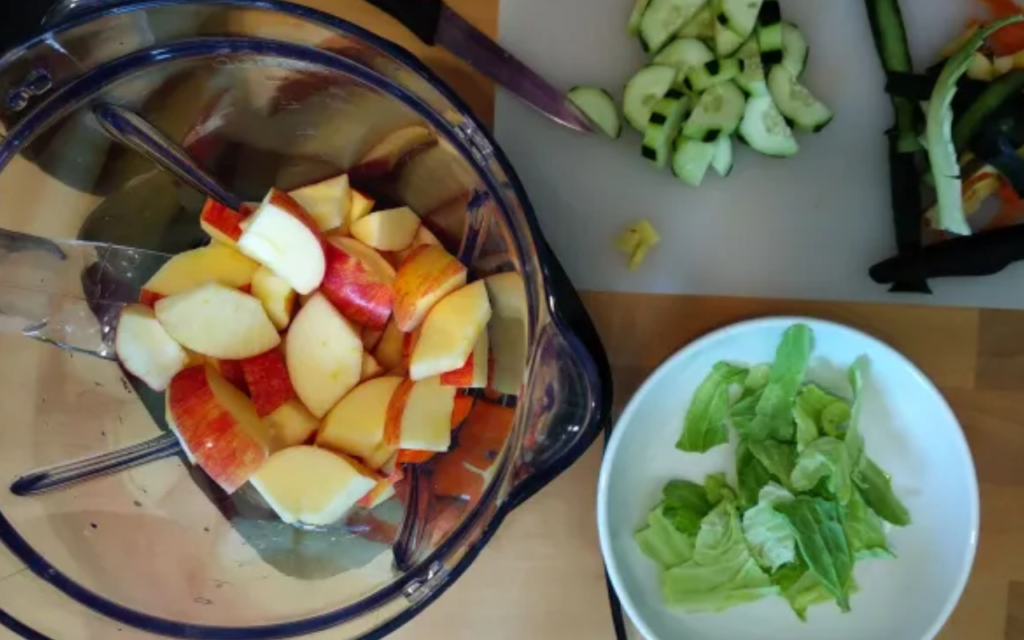 1. Prepare com carinho: Lave tudo bem. Se não for orgânico, descasque a cenoura, o pepino (deixando um pouquinho de casca) e as maçãs. Pique a cenoura em rodelas, as maçãs em pedaços (tire os caroços), o pepino em cubos e a couve em tiras (sem o talo duro).